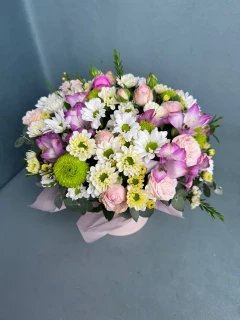 Эта элегантная шляпная коробка наполнена нежными розами, яркими альстромериями и великолепными хризантемами. Комбинация этих цветов создает неповторимое сочетание, которое идеально подойдет для особого случая или просто для того, чтобы порадовать близких своей красотой и изяществом. Нежные оттенки и изысканный дизайн этой композиции точно подчеркнут Вашу неповторимость и восхитят всех вокруг.